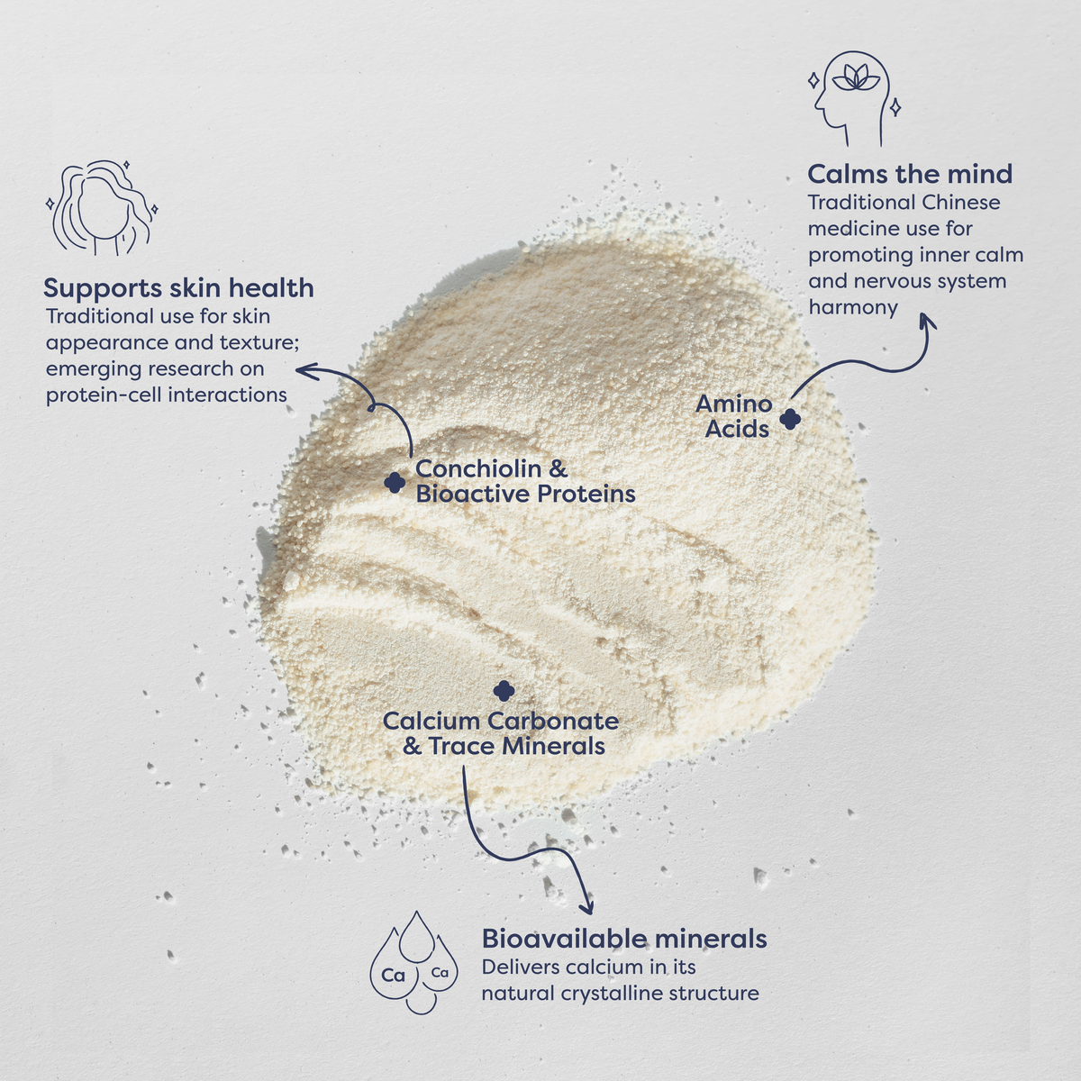 Pearl powder delivers minerals within their natural nacre matrix—a combination of calcium carbonate, trace minerals, amino acids, and structural proteins including conchiolin. Traditionally used in Chinese medicine to promote calm and support skin health, pearl powder provides calcium in its naturally occurring crystalline form. It has been used both internally and topically for centuries.